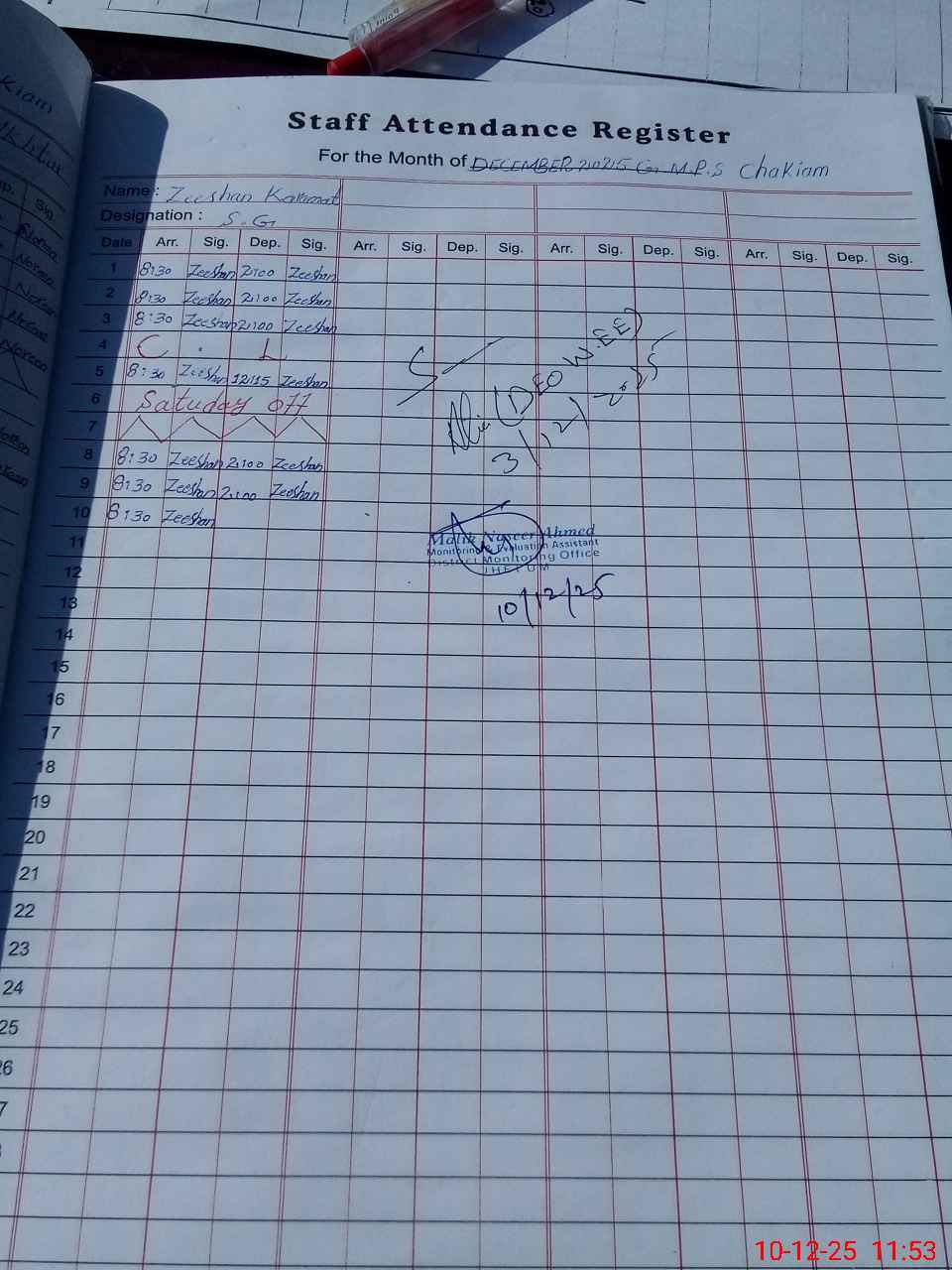 | CNIC | Full Name | Designation | R/C | Absence During Last Calender Month |