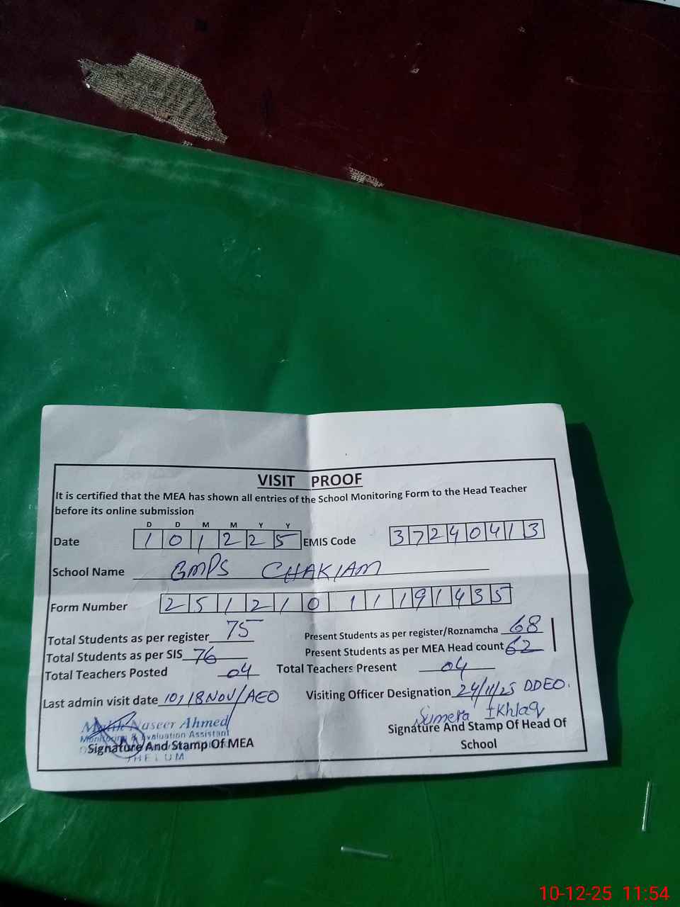 | Attendance Register | Head Teacher | MEA with School | Visit Proof |