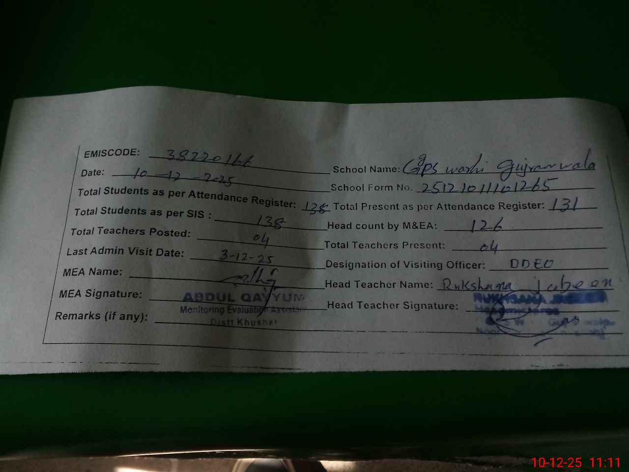 | Attendance Register | Head Teacher | MEA with School | Visit Proof |