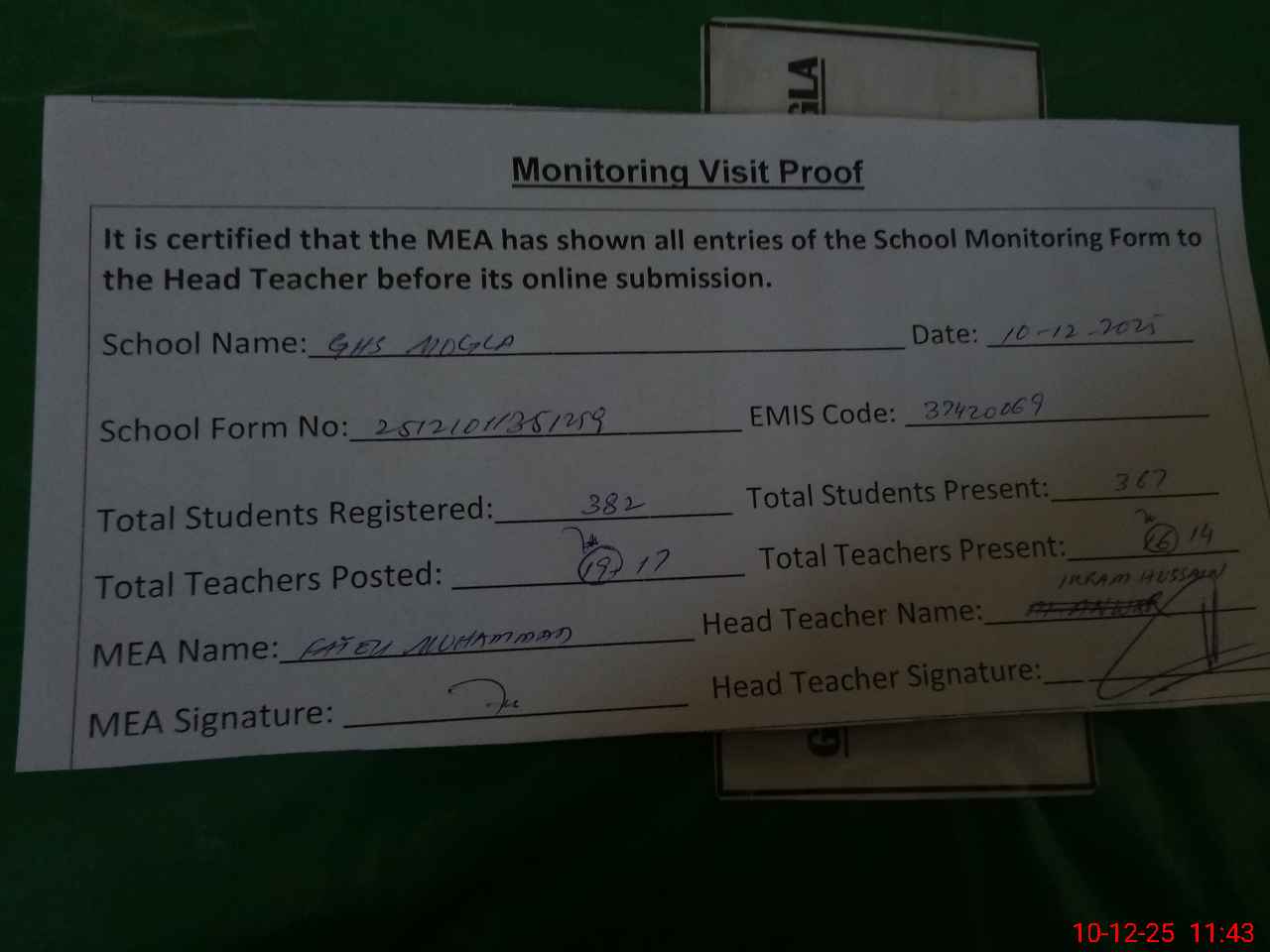 | Certified that this School was Inspected by the Undersigned MEA/DMO Today and the Information Stated Above is as Per Record. | |||||