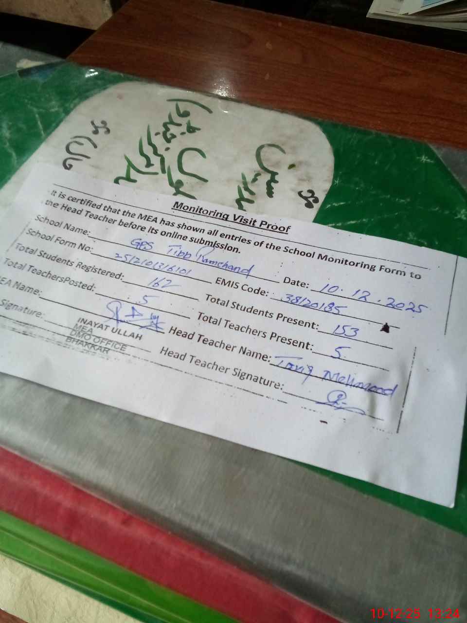 | Attendance Register | Head Teacher | MEA with School | Visit Proof |