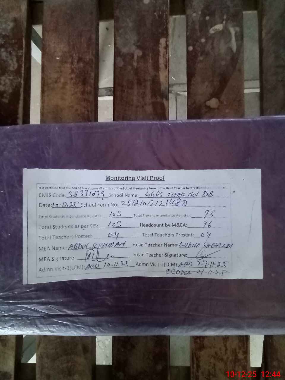 | Attendance Register | Head Teacher | MEA with School | Visit Proof |