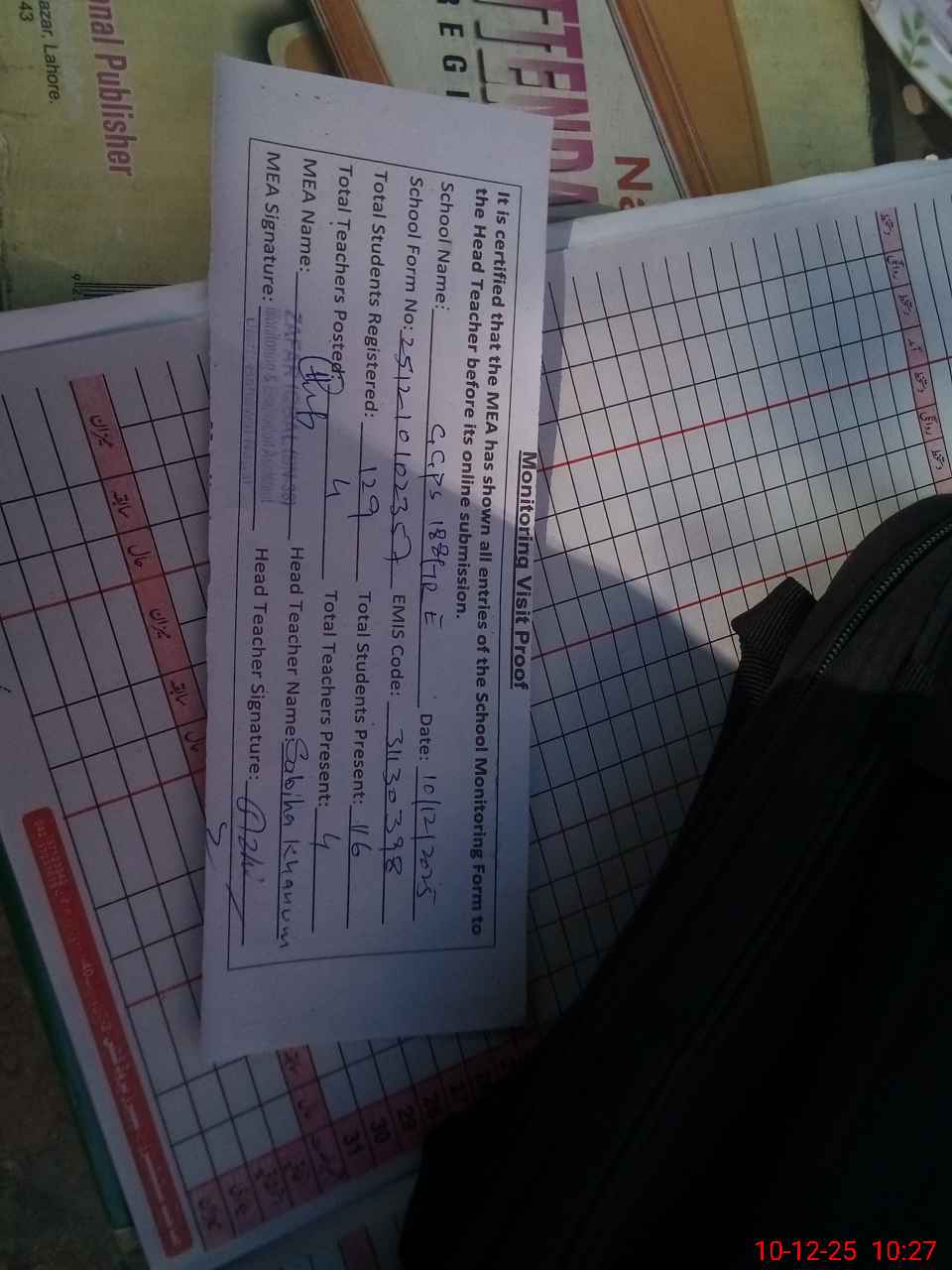 | Attendance Register | Head Teacher | MEA with School | Visit Proof |