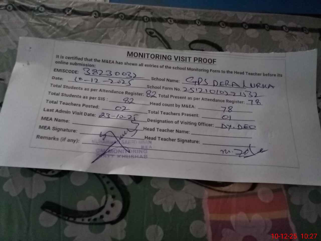 | Remarks (Use Separate Page if Required): Students on SIS QTY 82 Last admin visit On 23 October 2025 by Dy DEO | |||||