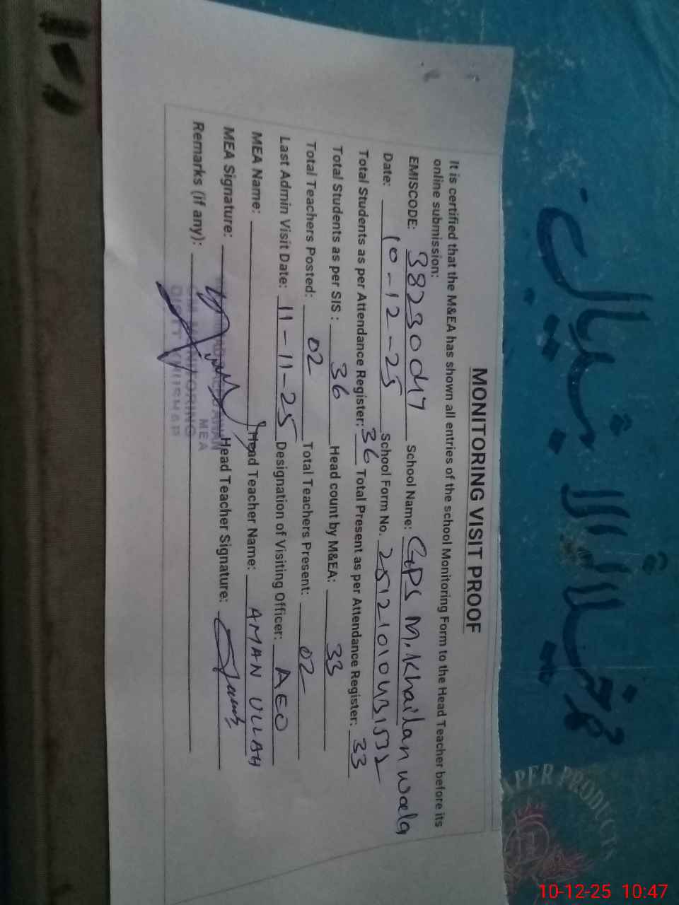 | Remarks (Use Separate Page if Required): Students on SIS QTY 36 Last admin visit On 11 November 2025 by AEO | |||||