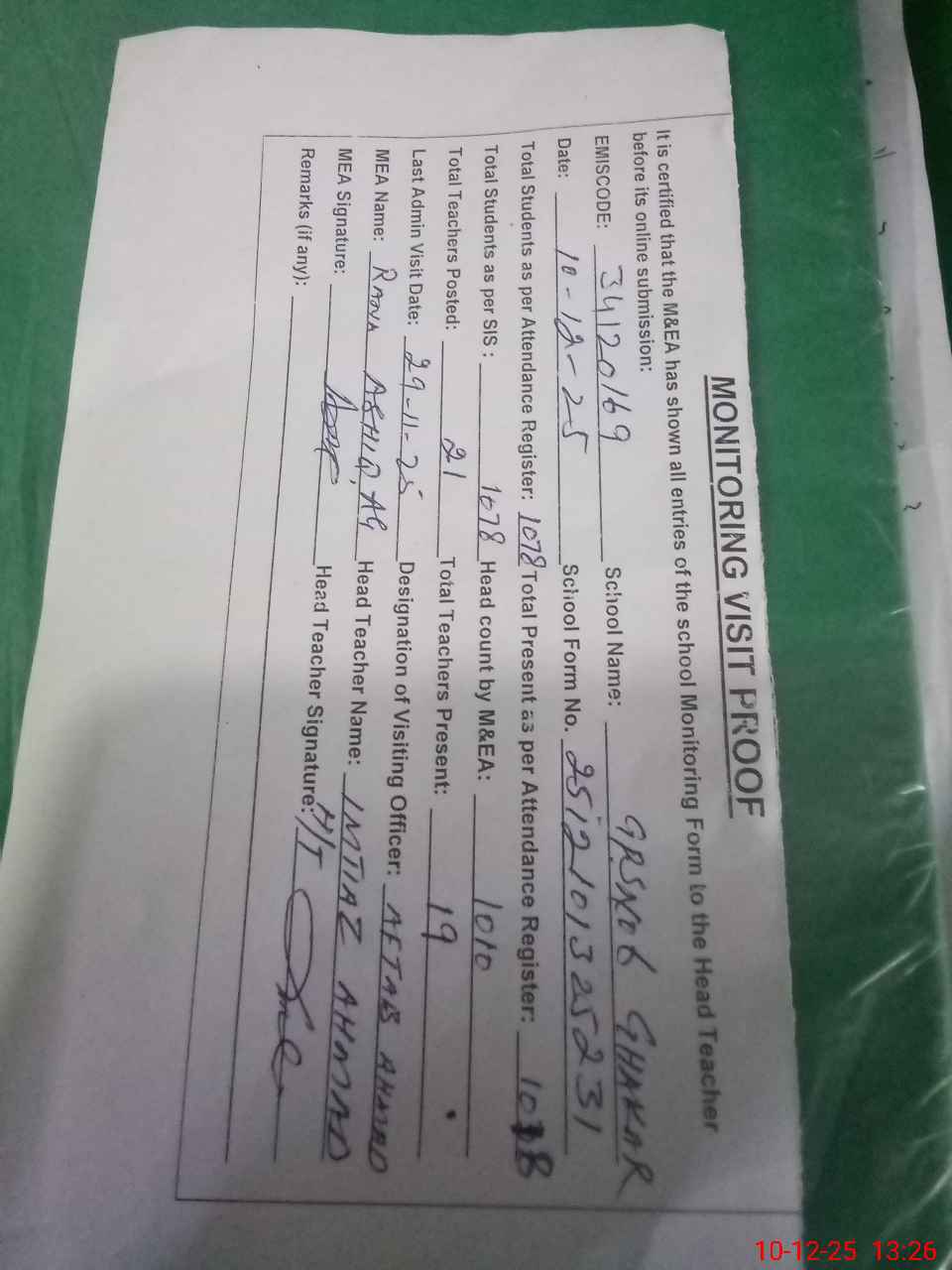 | Attendance Register | Head Teacher | MEA with School | Visit Proof |