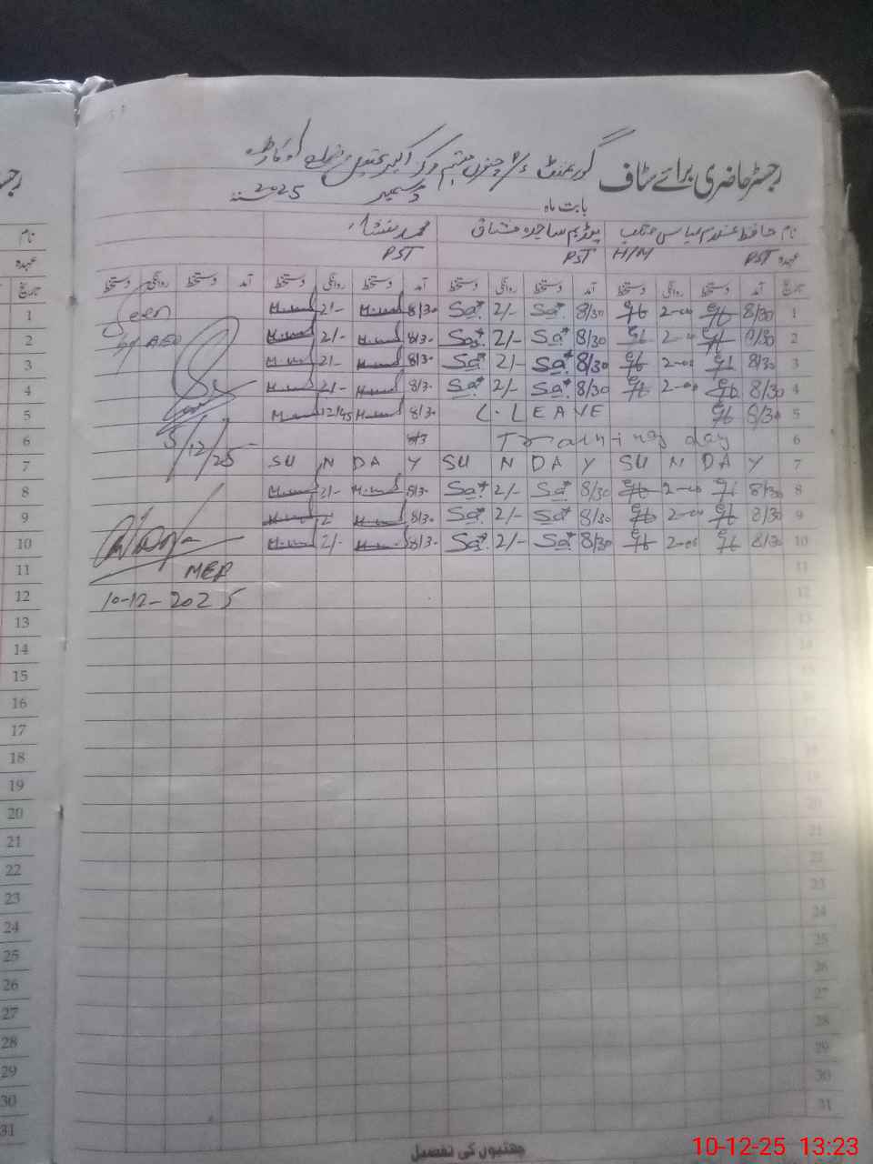 | CNIC | Full Name | Designation | R/C | Absence During Last Calender Month |