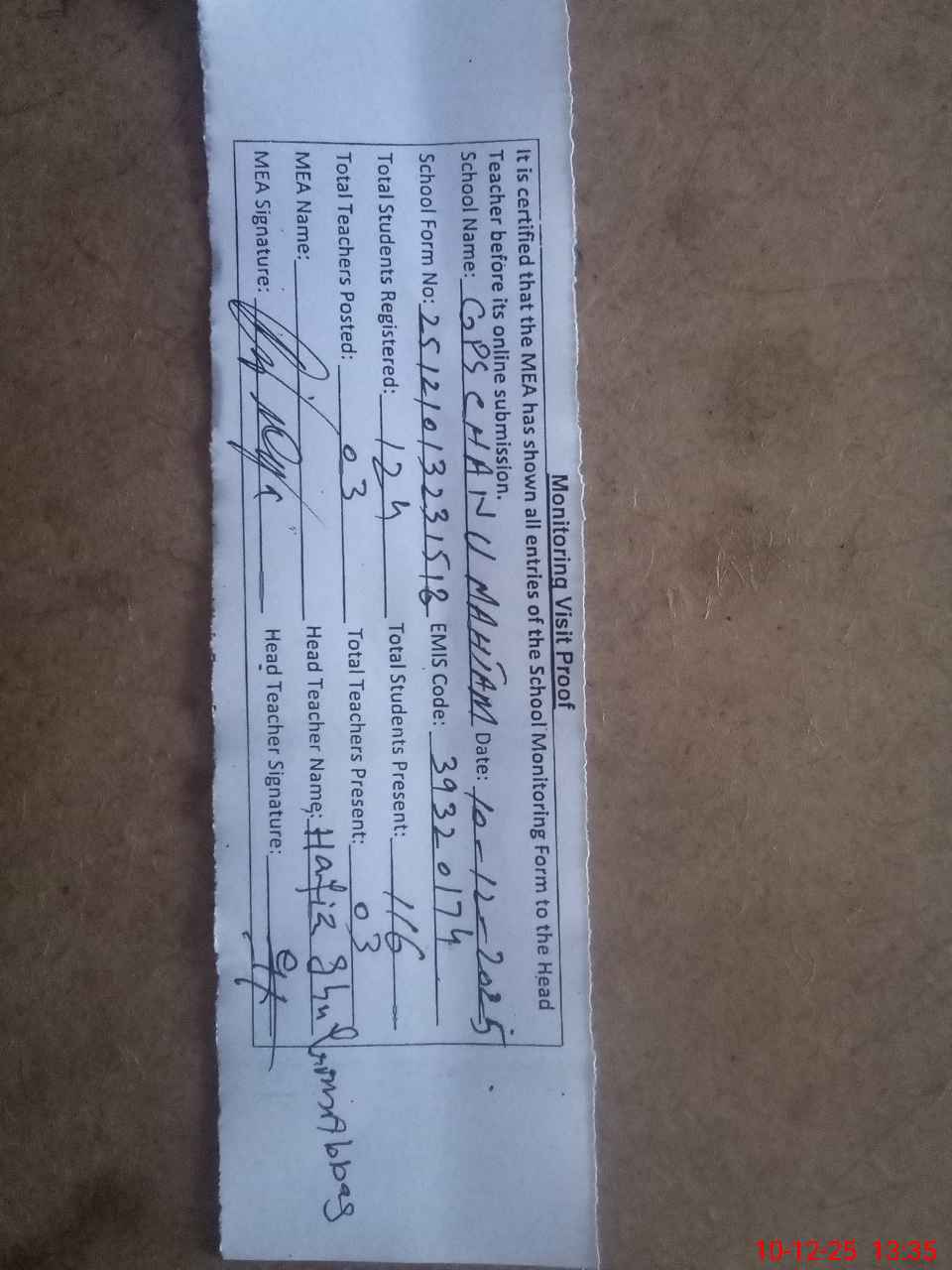 | Attendance Register | Head Teacher | MEA with School | Visit Proof |