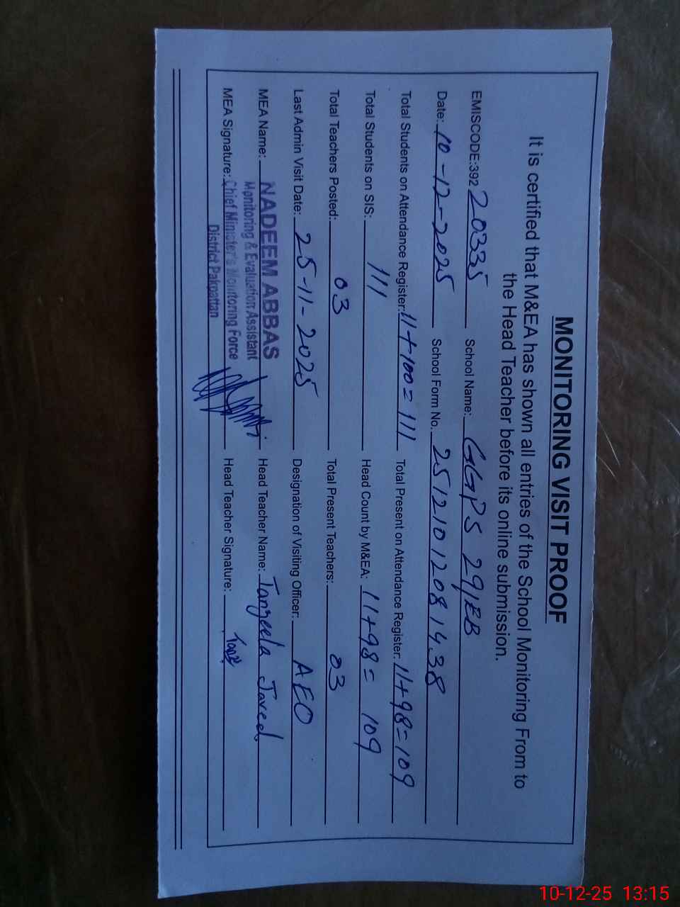 | Attendance Register | Head Teacher | MEA with School | Visit Proof |