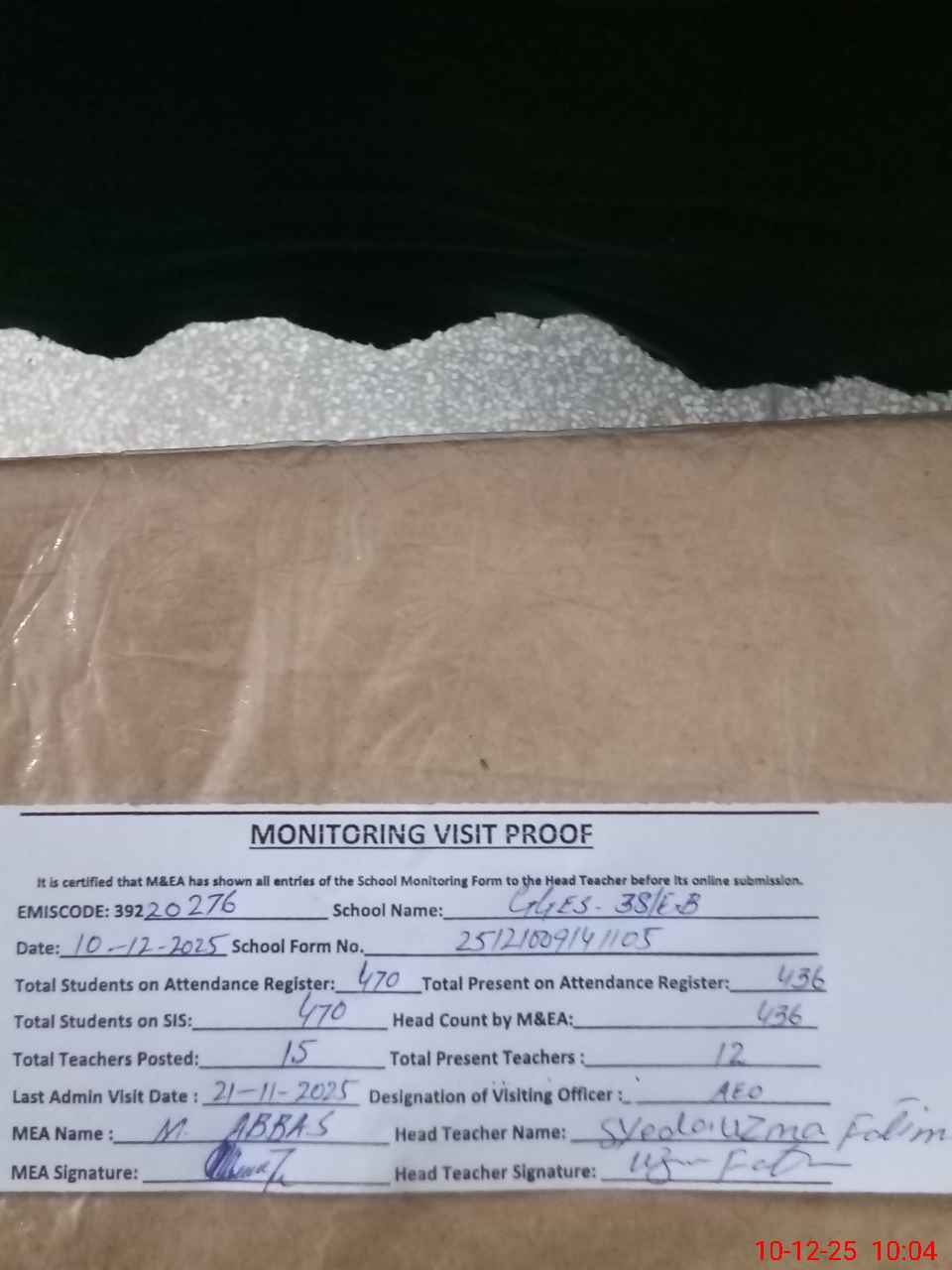 | Monitoring Date: 10-12-2025 | Start Time: 10-12-2025 09:14 AM | End Time: 10-12-2025 10:05 AM | Name of MEA: Mu**** Ab**** | |