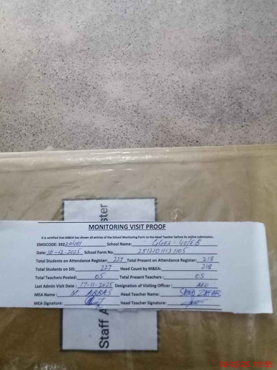 | Attendance Register | Head Teacher | MEA with School | Visit Proof |