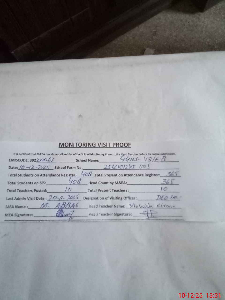 | Attendance Register | Head Teacher | MEA with School | Visit Proof |