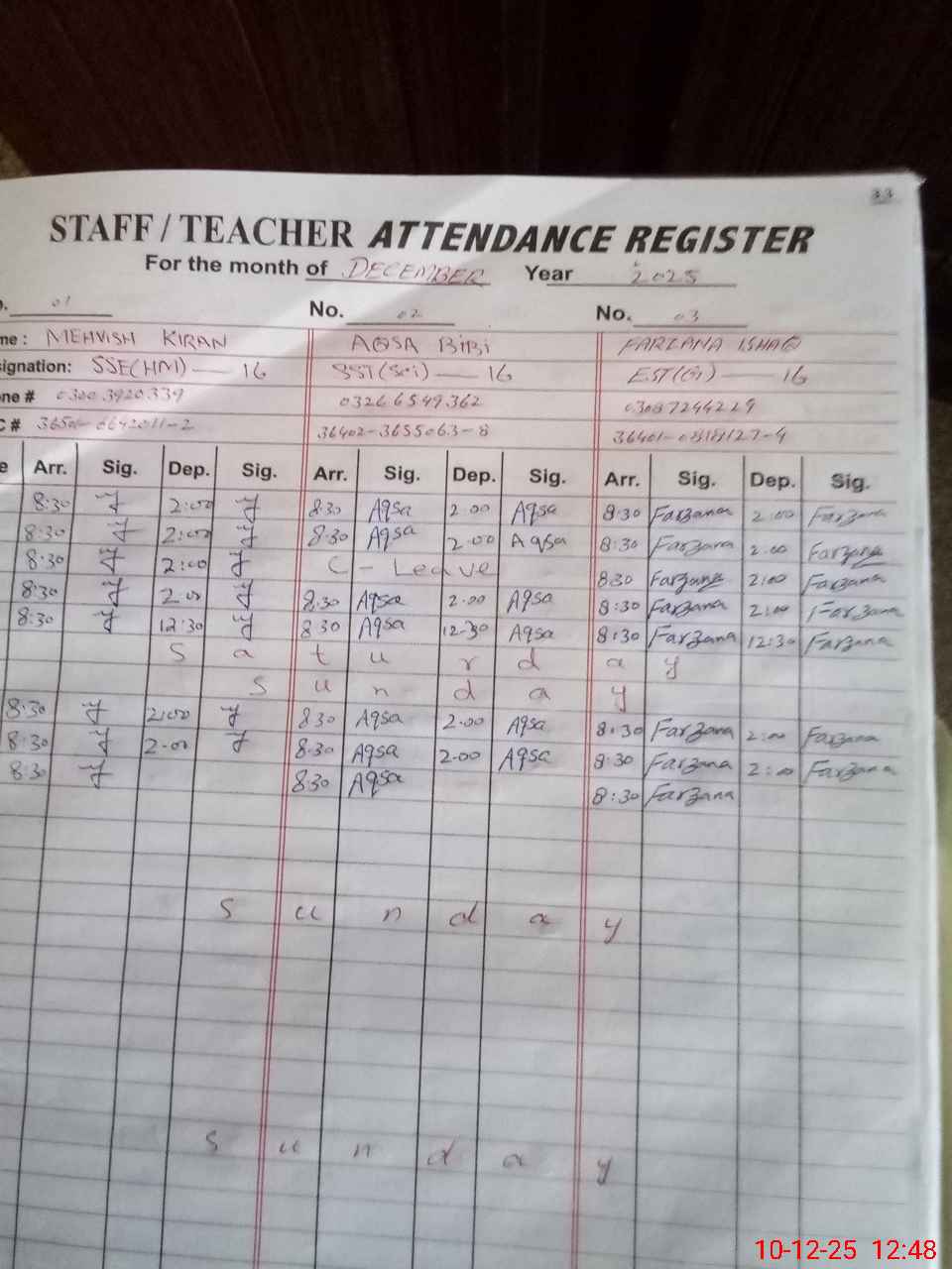 | CNIC | Full Name | Designation | R/C | Absence During Last Calender Month |