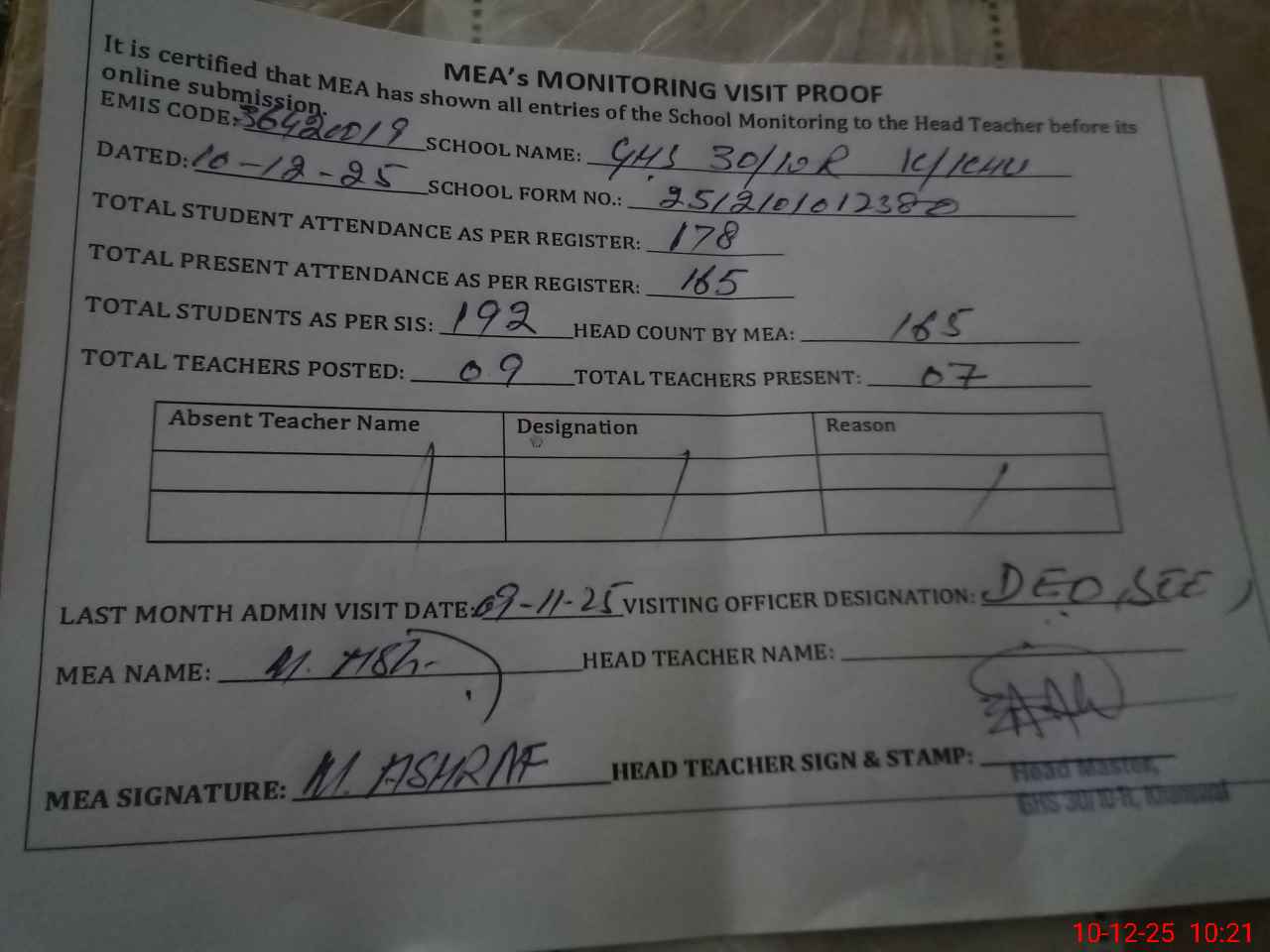 | Attendance Register | Head Teacher | MEA with School | Visit Proof |