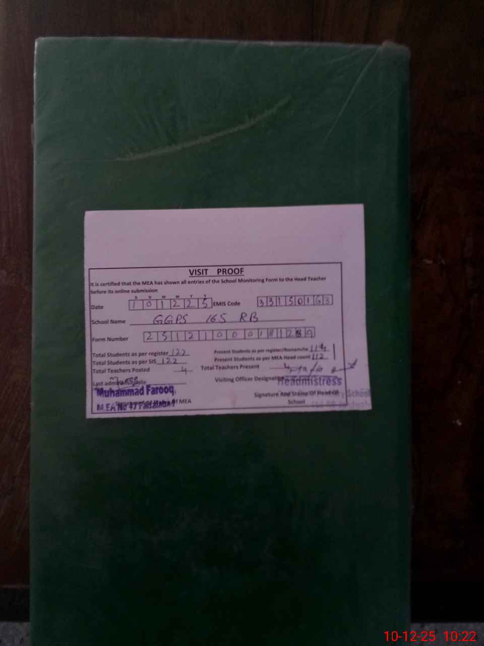 | EMIS Code: 33150163 | Name of School: GGPS CHAK 165 RB | |||