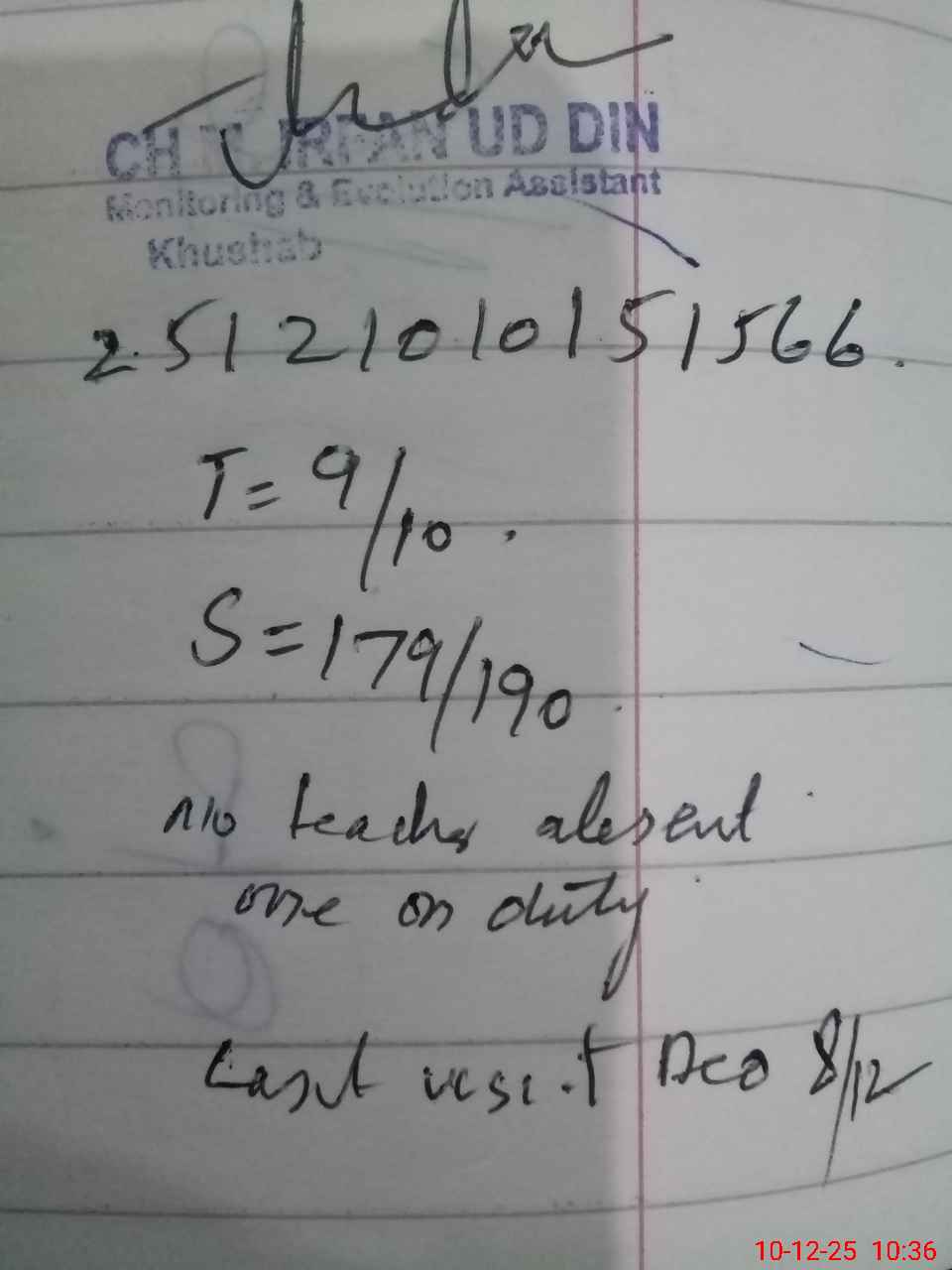 | Remarks (Use Separate Page if Required): student on sis 190 student on register 190 head count 179 no teacher absent one on official duty pser last visit 8/12/25 aeo teacher ng staff is very low staff required boundary wall less than 8 feet | |||||