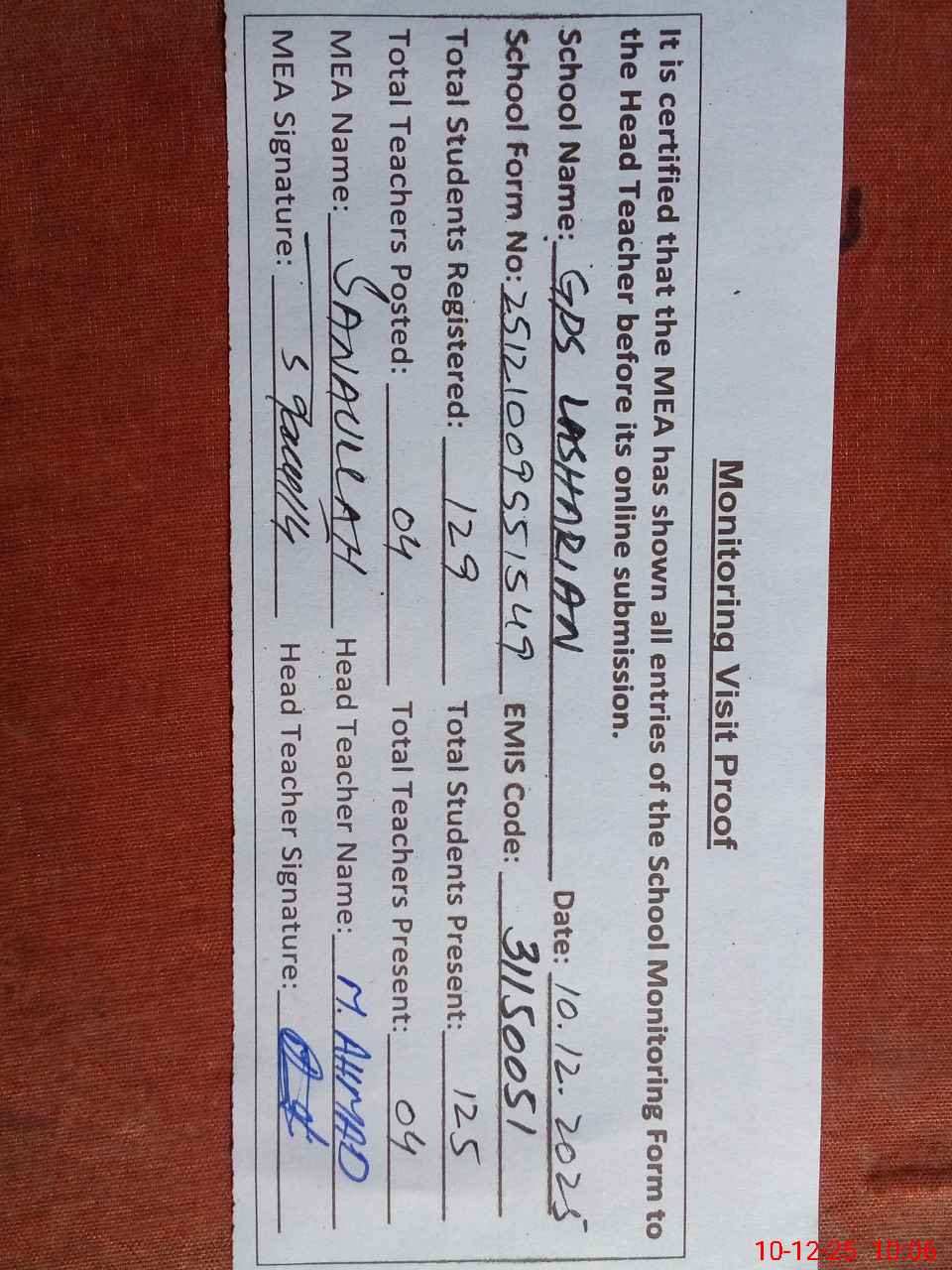 | Attendance Register | Head Teacher | MEA with School | Visit Proof |