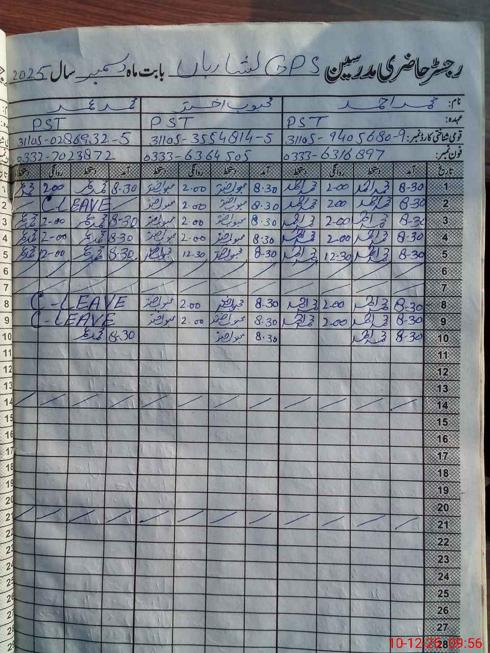 | CNIC | Full Name | Designation | R/C | Absence during last cal. month |