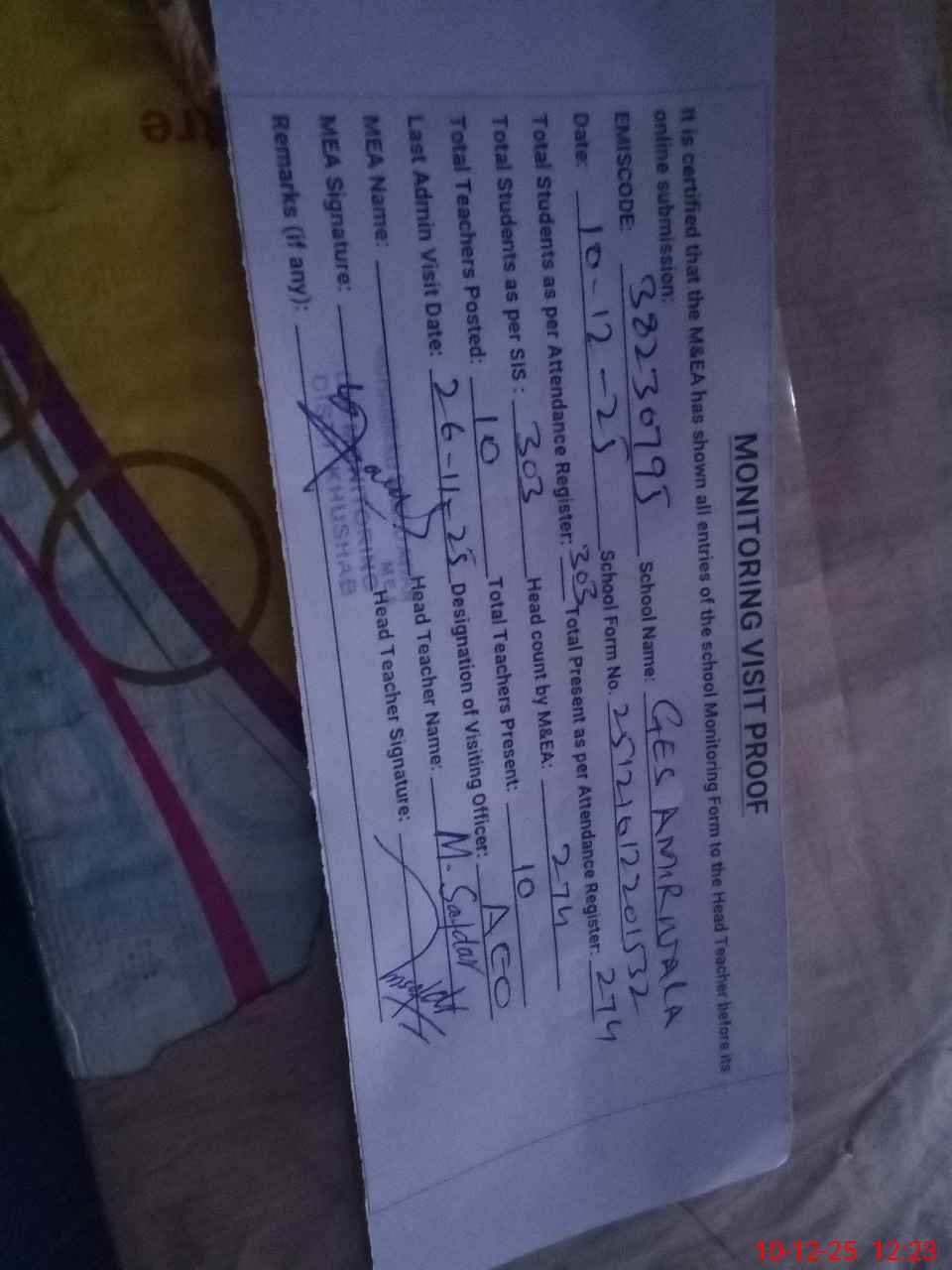 | Remarks (Use Separate Page if Required): Students on SIS QTY 303 Last admin visit On 26 November 2025 by AEO | |||||