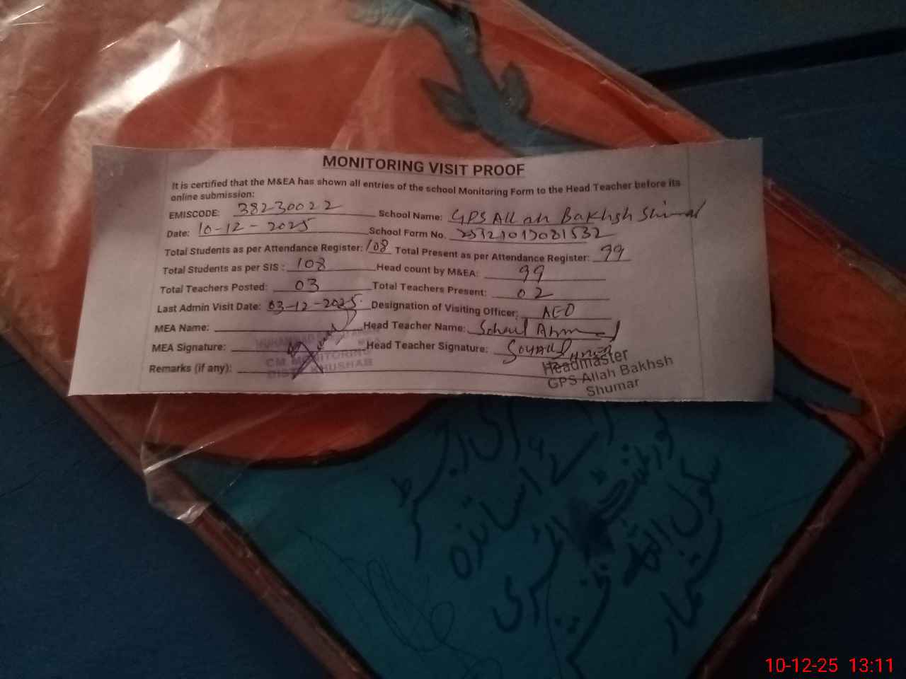 | Remarks (Use Separate Page if Required): Students on SIS QTY 108 Last admin visit On 03 December 2025 by AEO | |||||