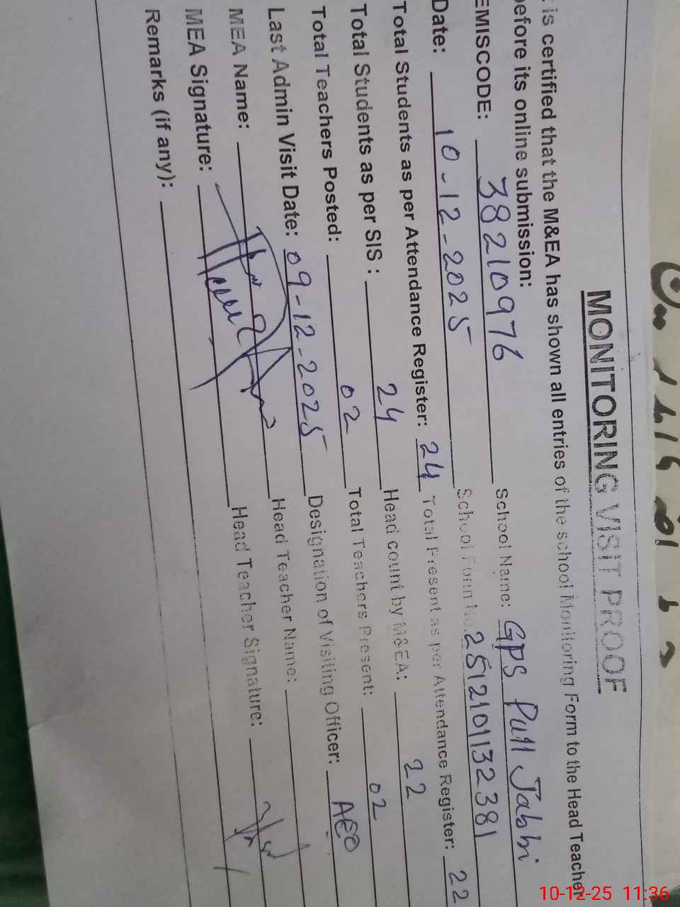 | Attendance Register | Head Teacher | MEA with School | Visit Proof |