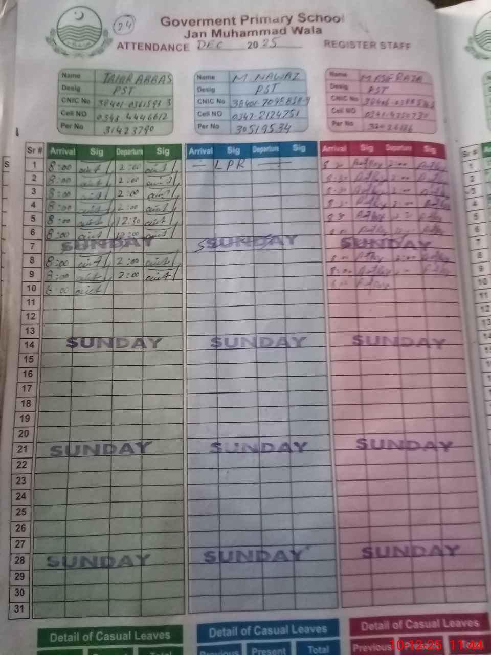 | CNIC | Full Name | Designation | R/C | Absence during last cal. month |