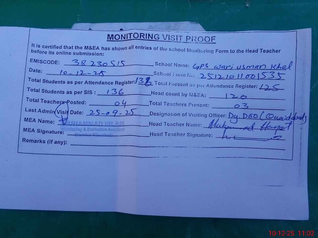 | Remarks (Use Separate Page if Required): Dy DEO visited school on 25 November 2025 Students strength on sis 136 | |||||