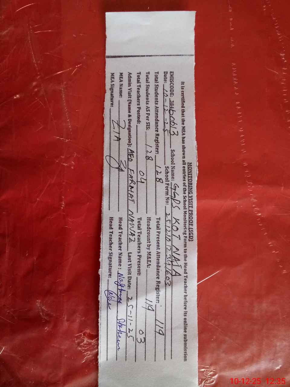 | Attendance Register | Head Teacher | MEA with School | Visit Proof |