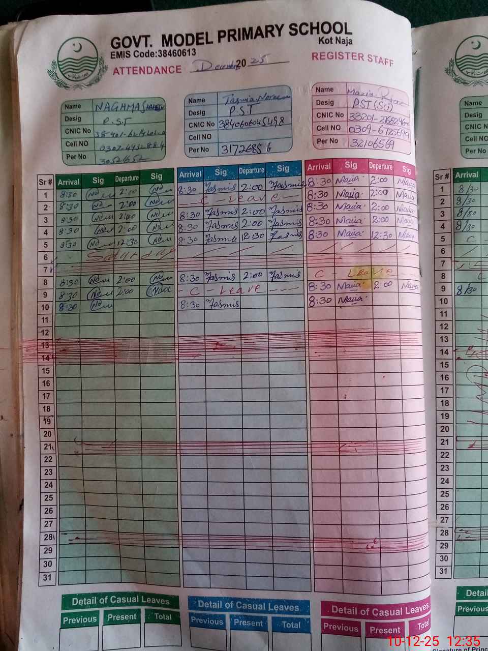 | CNIC | Full Name | Designation | R/C | Absence During Last Calender Month |