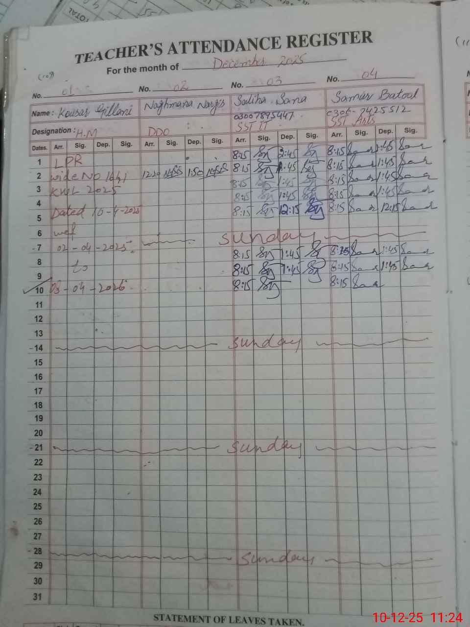 | CNIC | Full Name | Designation | R/C | Absence During Last Calender Month |