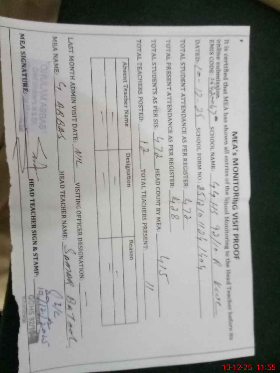 | Attendance Register | Head Teacher | MEA with School | Visit Proof |
