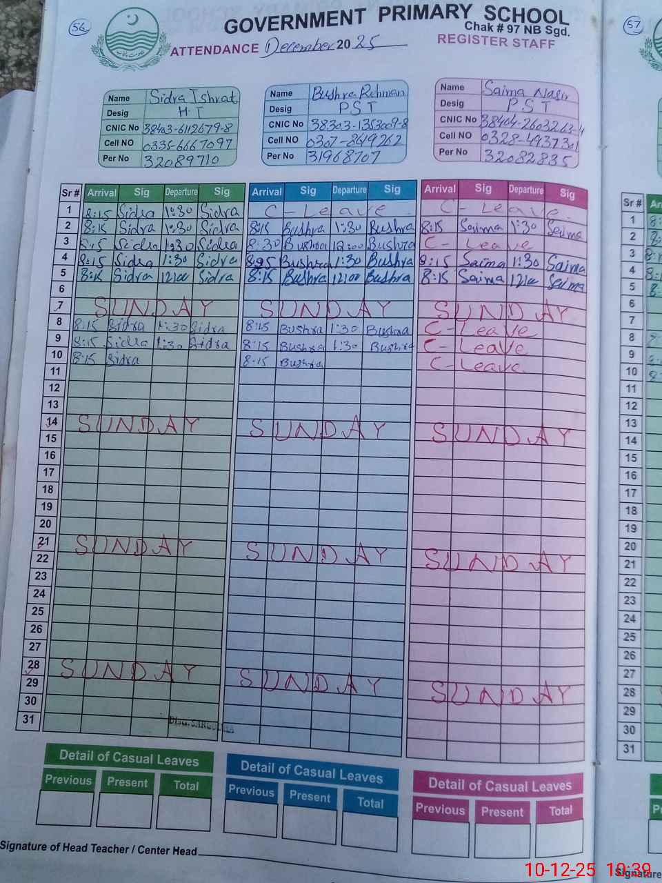 | CNIC | Full Name | Designation | R/C | Absence During Last Calender Month |