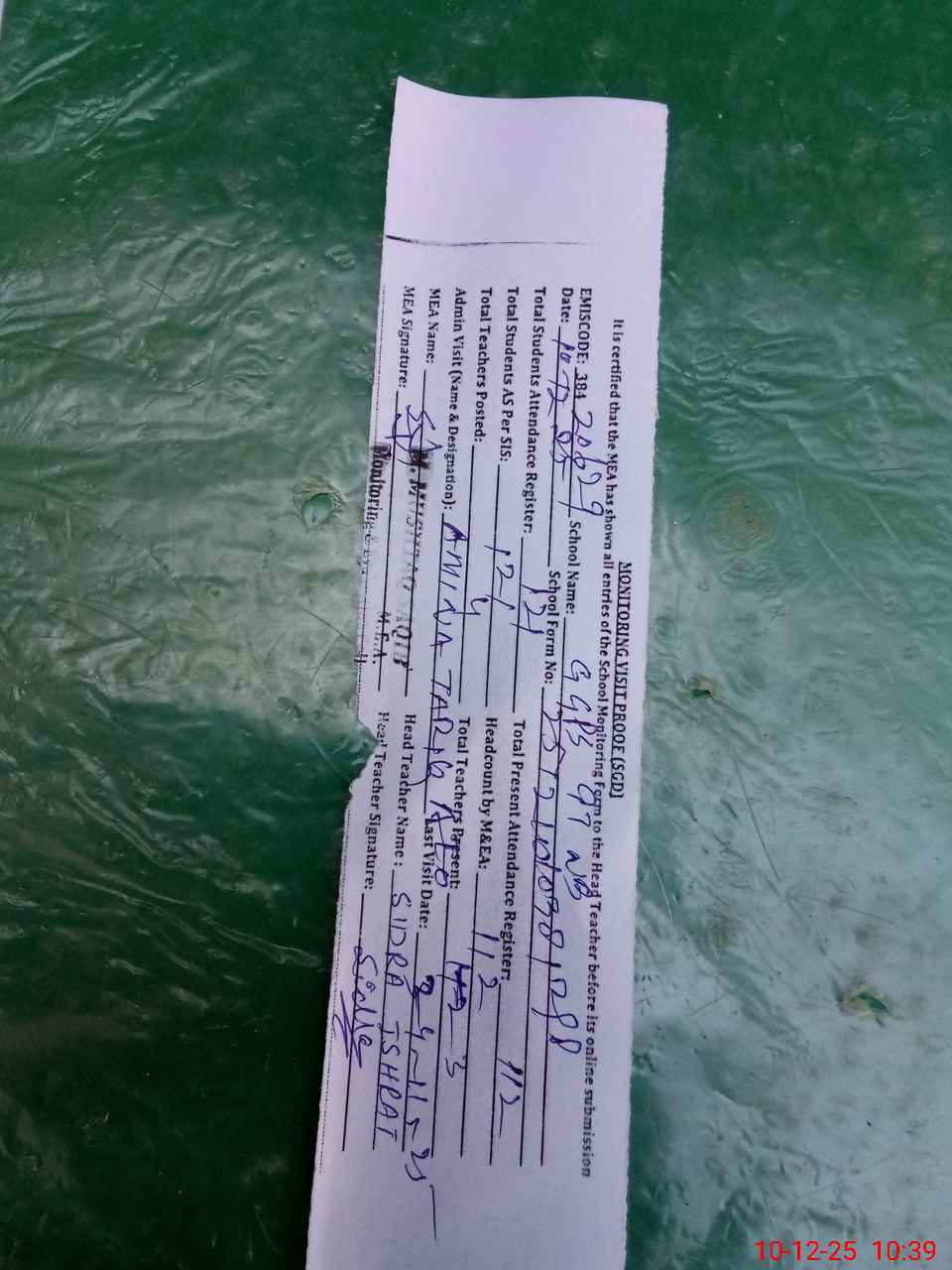 | Attendance Register | Head Teacher | MEA with School | Visit Proof |