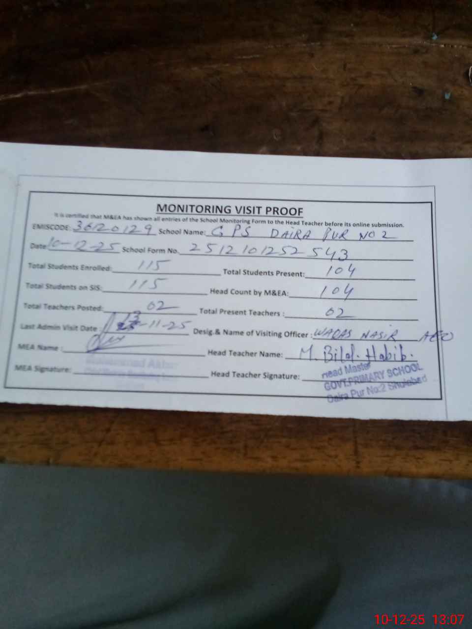 | EMIS Code: 36120129 | Name of School: GPS DAIRA PUR NO. 2 SHUJA ABAD | |||