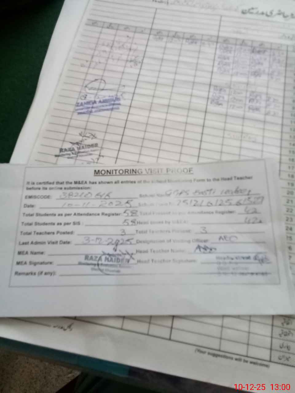 | Attendance Register | Head Teacher | MEA with School | Visit Proof |