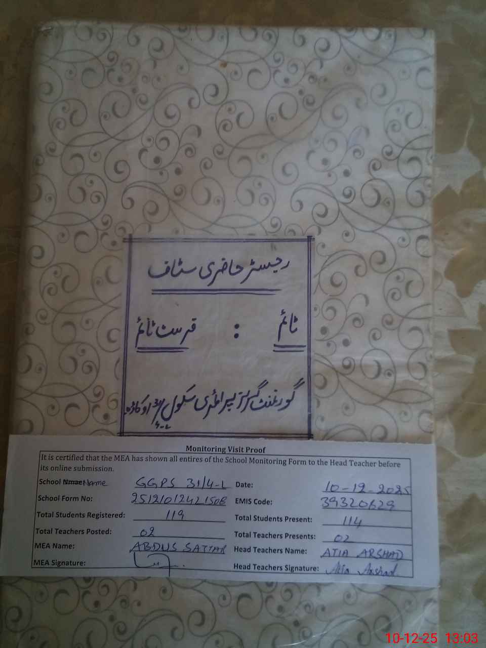 | Attendance Register | Head Teacher | MEA with School | Visit Proof |