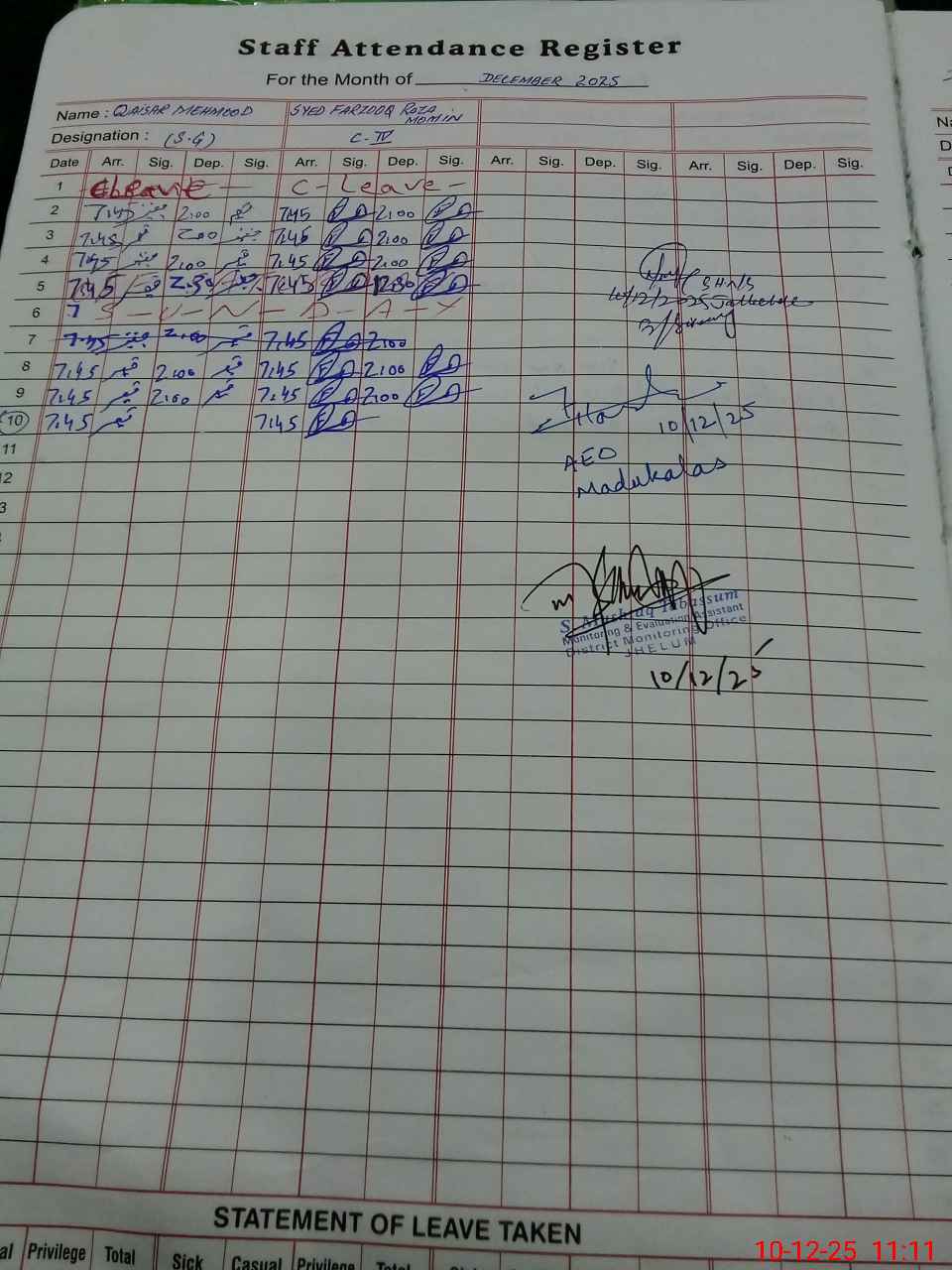| Monitoring Date: 10-12-2025 | Start Time: 10-12-2025 10:33 AM | End Time: 10-12-2025 11:21 AM | Name of MEA: Sh**** Mu**** Ta**** | |