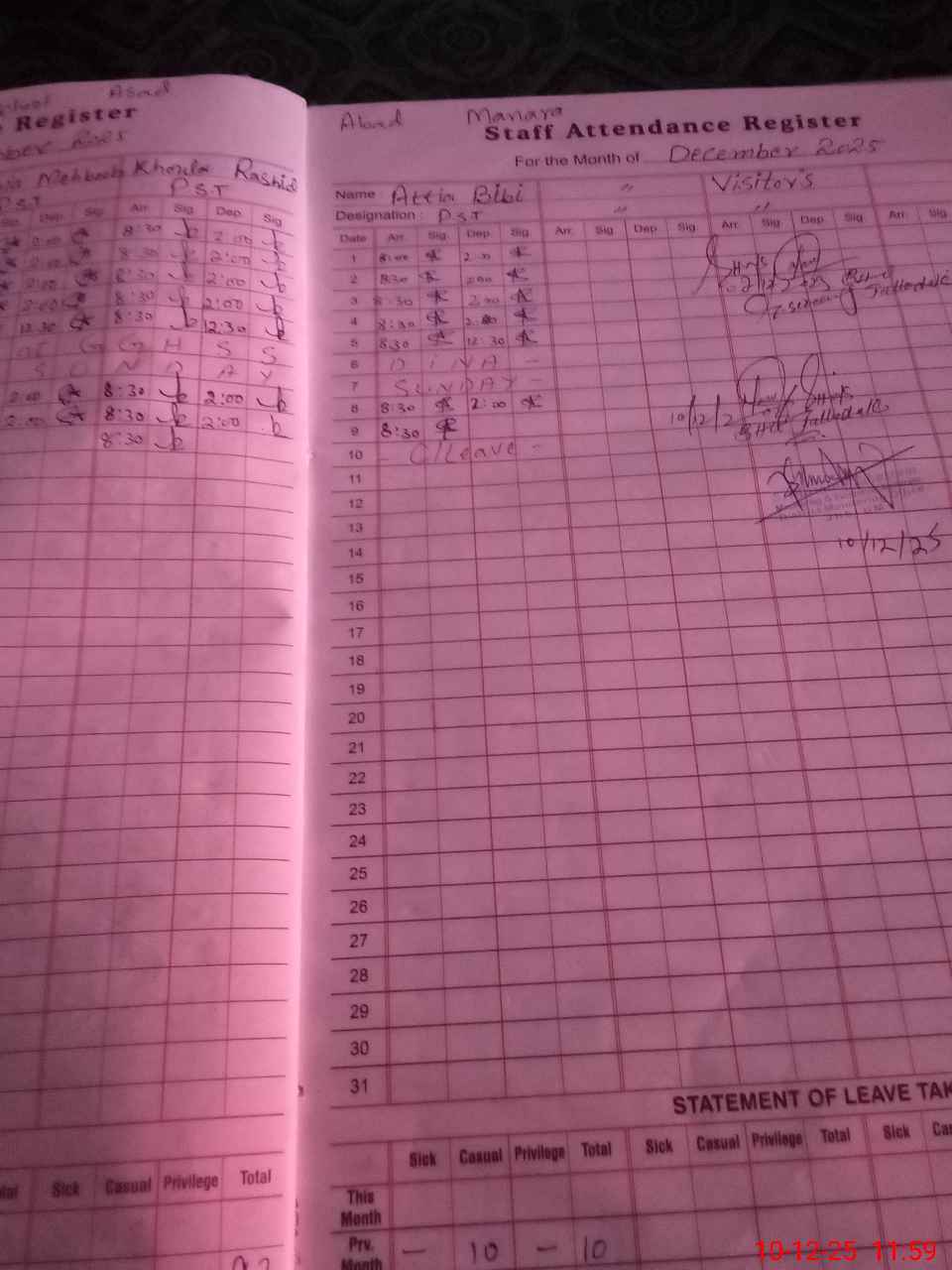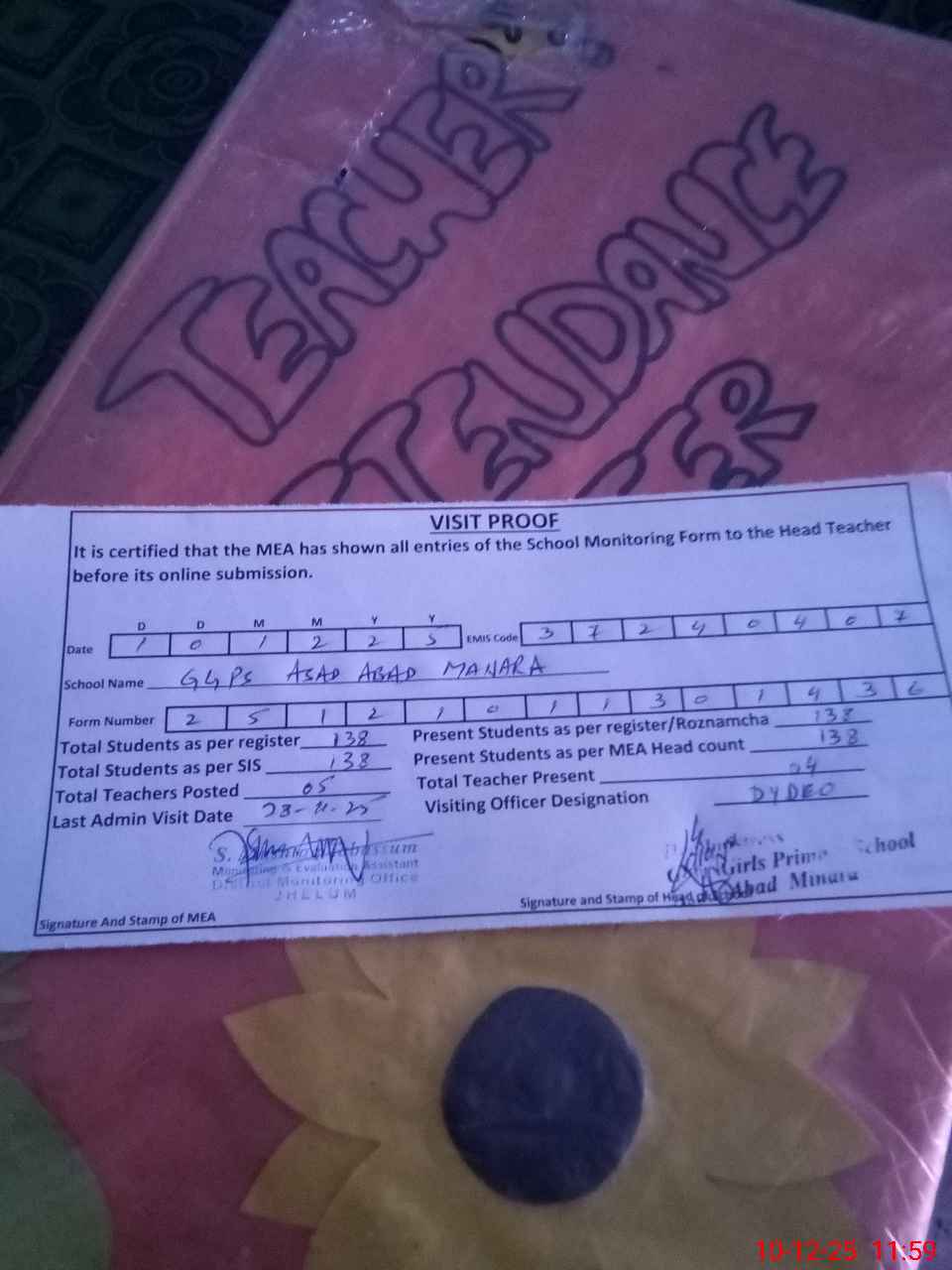 | Attendance Register | Head Teacher | MEA with School | Visit Proof |
