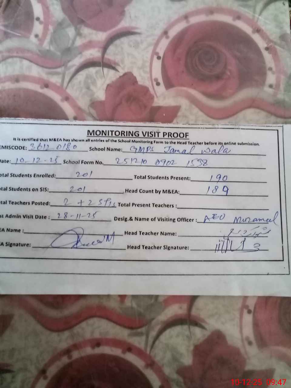 | Attendance Register | Head Teacher | MEA with School | Visit Proof |
