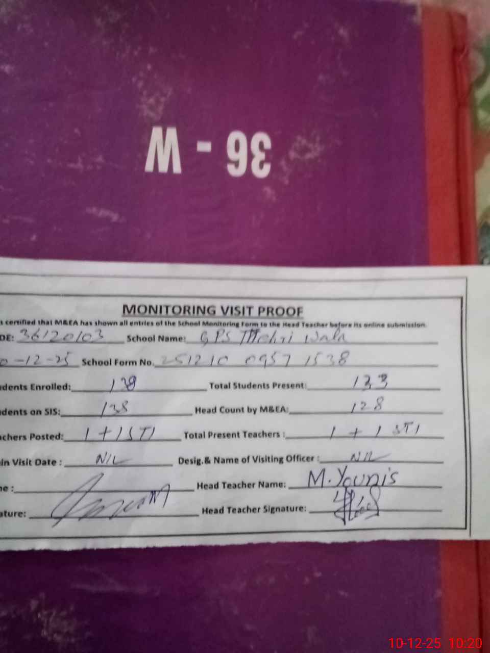 | Attendance Register | Head Teacher | MEA with School | Visit Proof |
