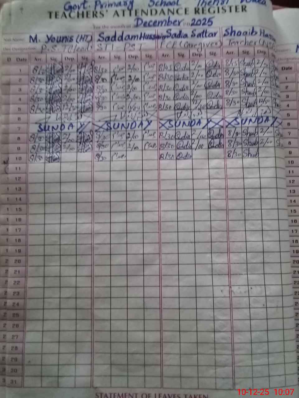 | CNIC | Full Name | Designation | R/C | Absence During Last Calender Month |