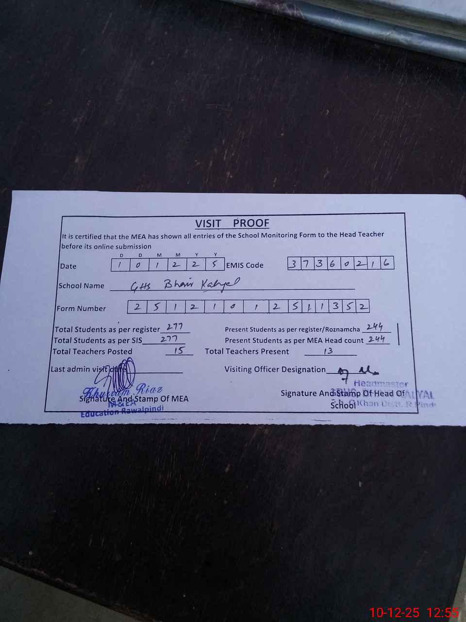 | Certified that this School was Inspected by the Undersigned MEA/DMO Today and the Information Stated Above is as Per Record. | |||||
