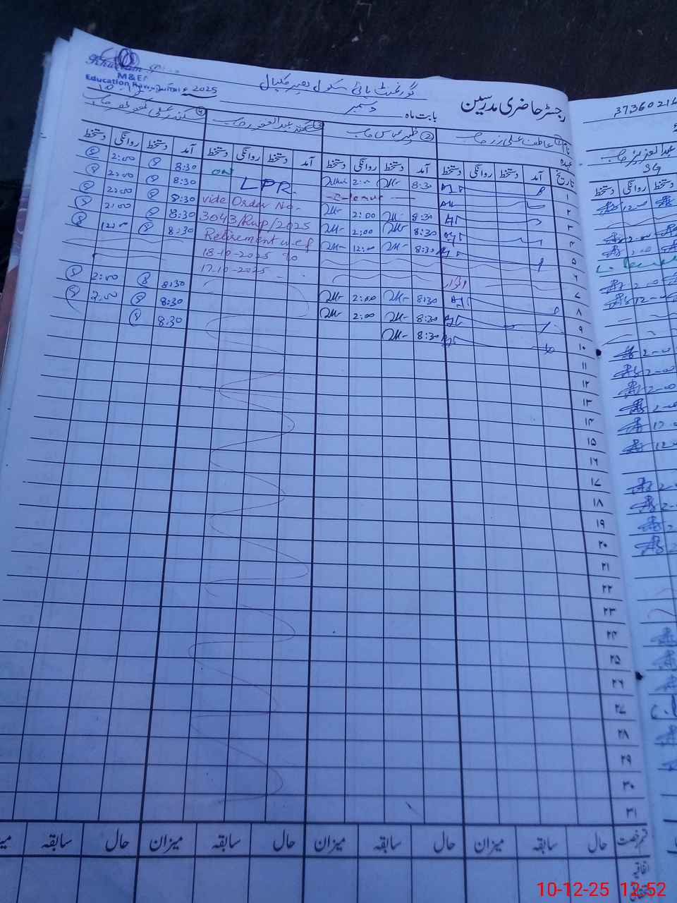 | CNIC | Full Name | Designation | R/C | Absence During Last Calender Month |