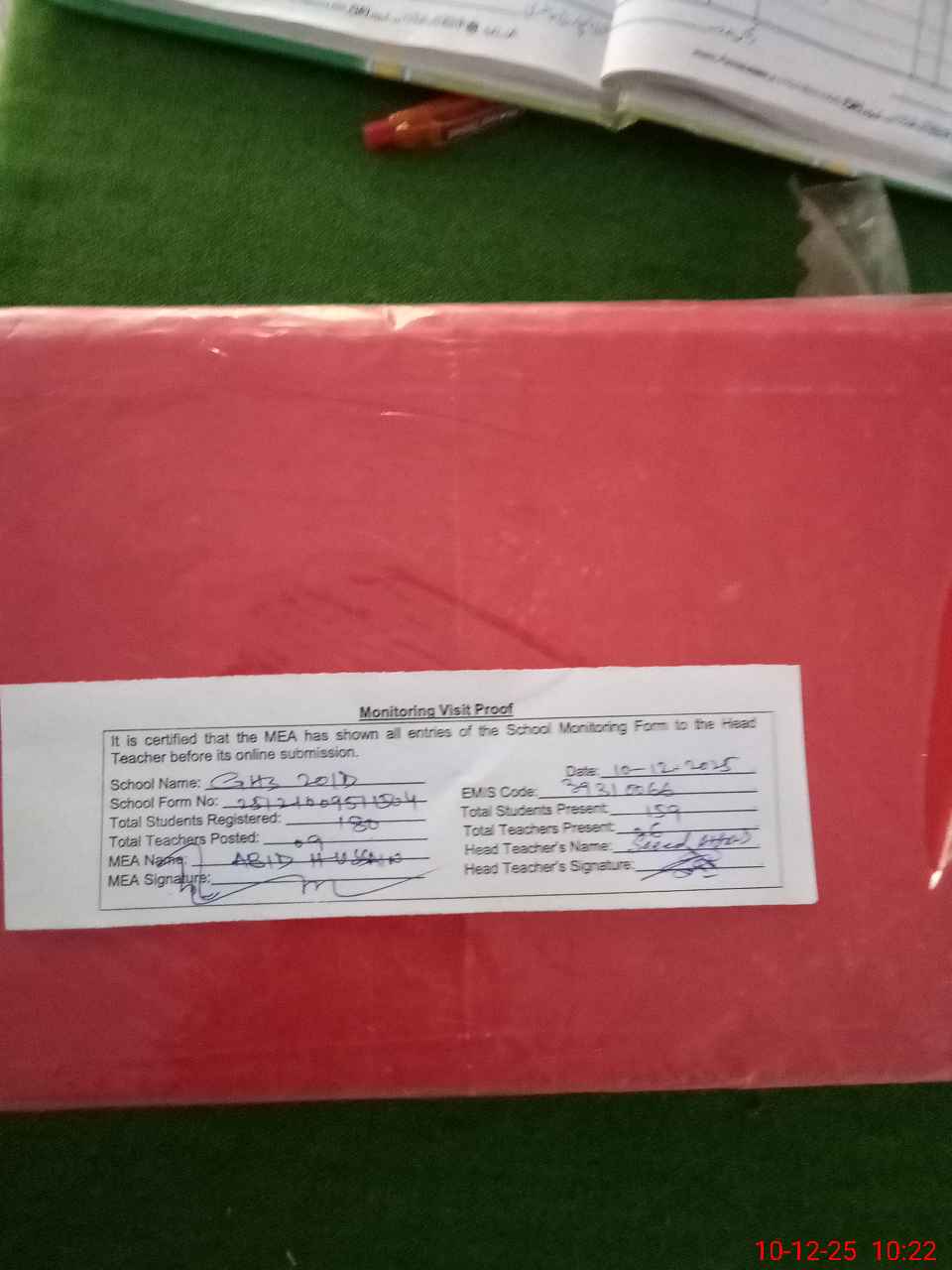 | Attendance Register | Head Teacher | MEA with School | Visit Proof |