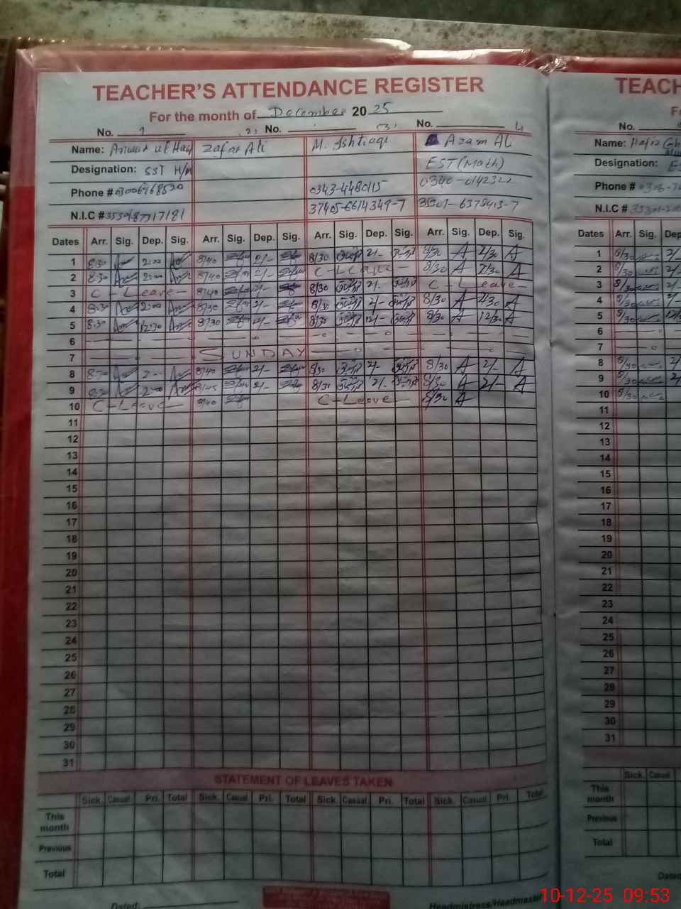 | CNIC | Full Name | Designation | R/C | Absence during last cal. month |
