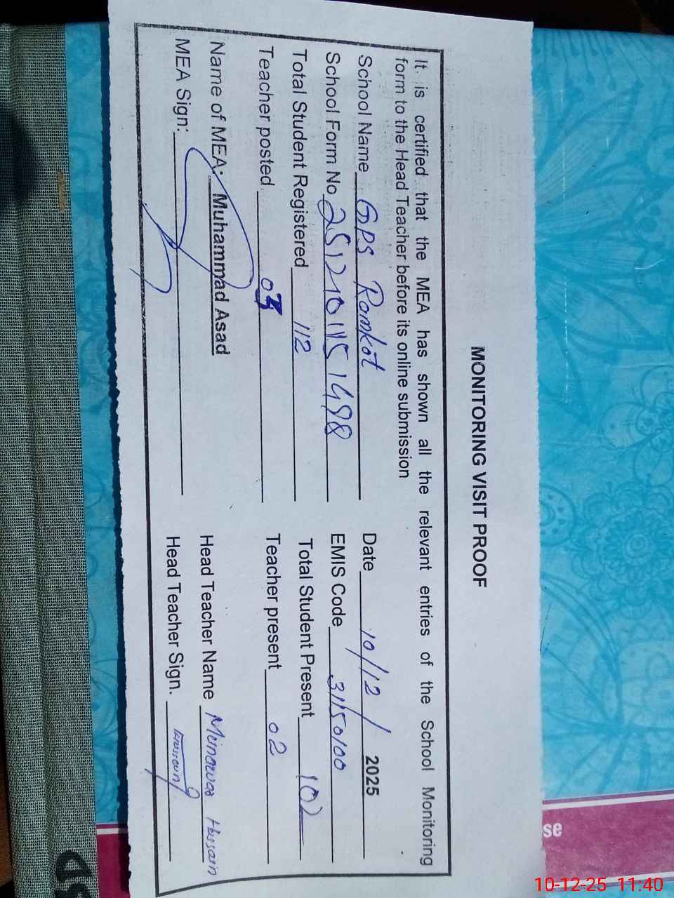 | Attendance Register | Head Teacher | MEA with School | Visit Proof |