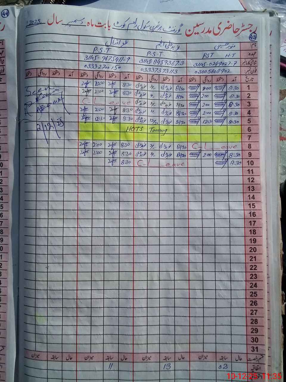 | CNIC | Full Name | Designation | R/C | Absence During Last Calender Month |