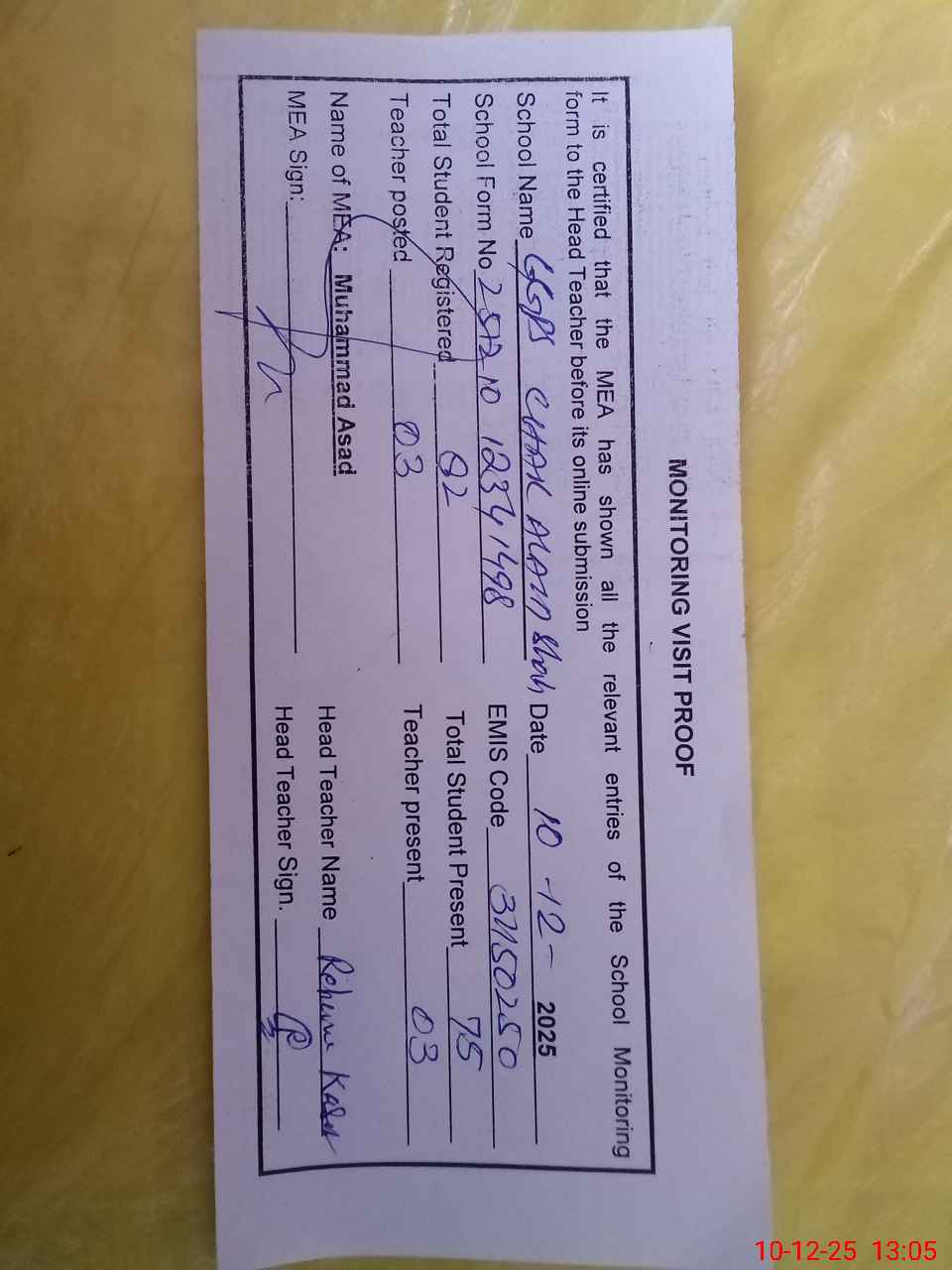 | EMIS Code: 31150250 | Name of School: GGPS CHAK ALAM SHAH | |||