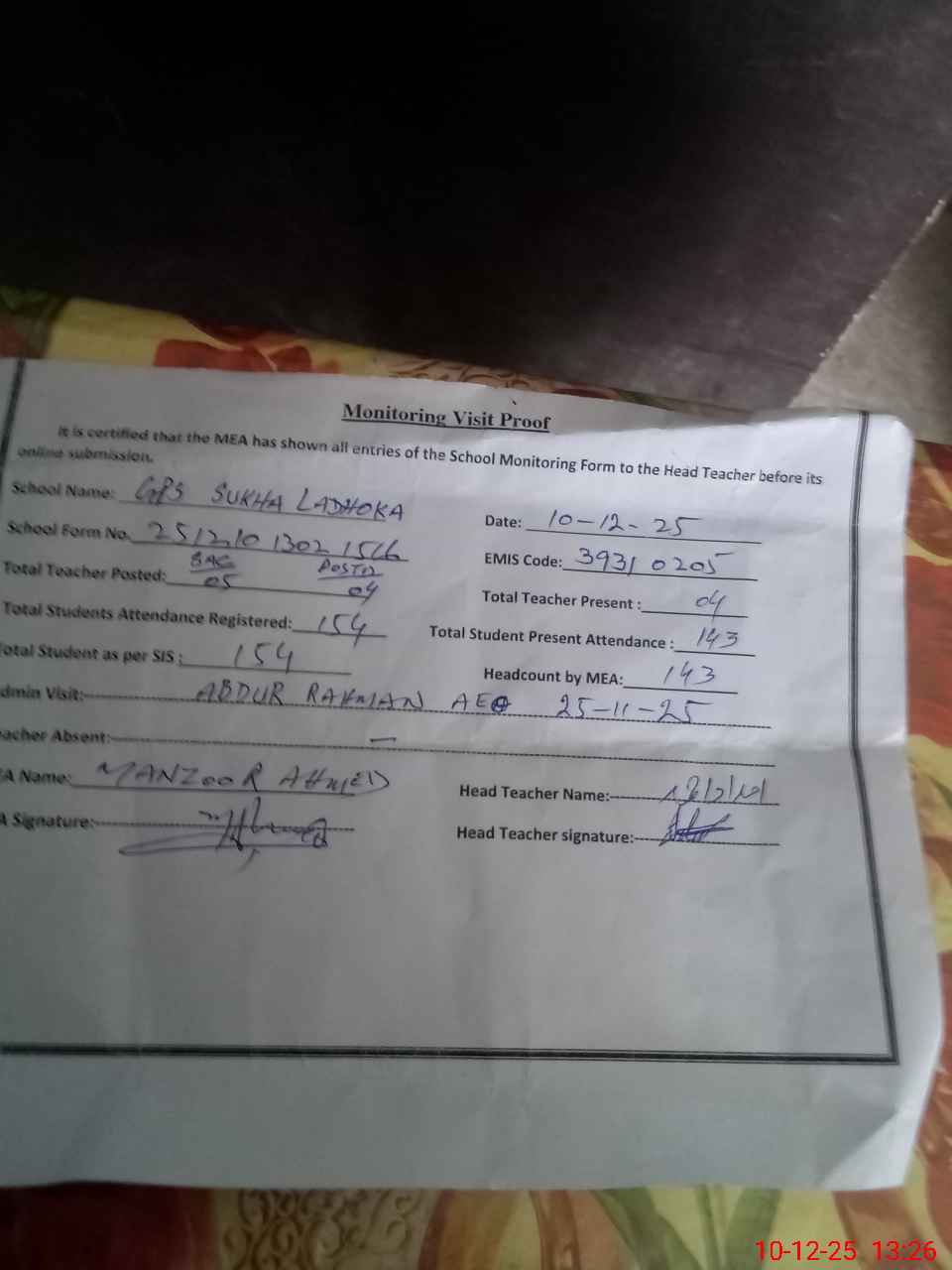 | Attendance Register | Head Teacher | MEA with School | Visit Proof |