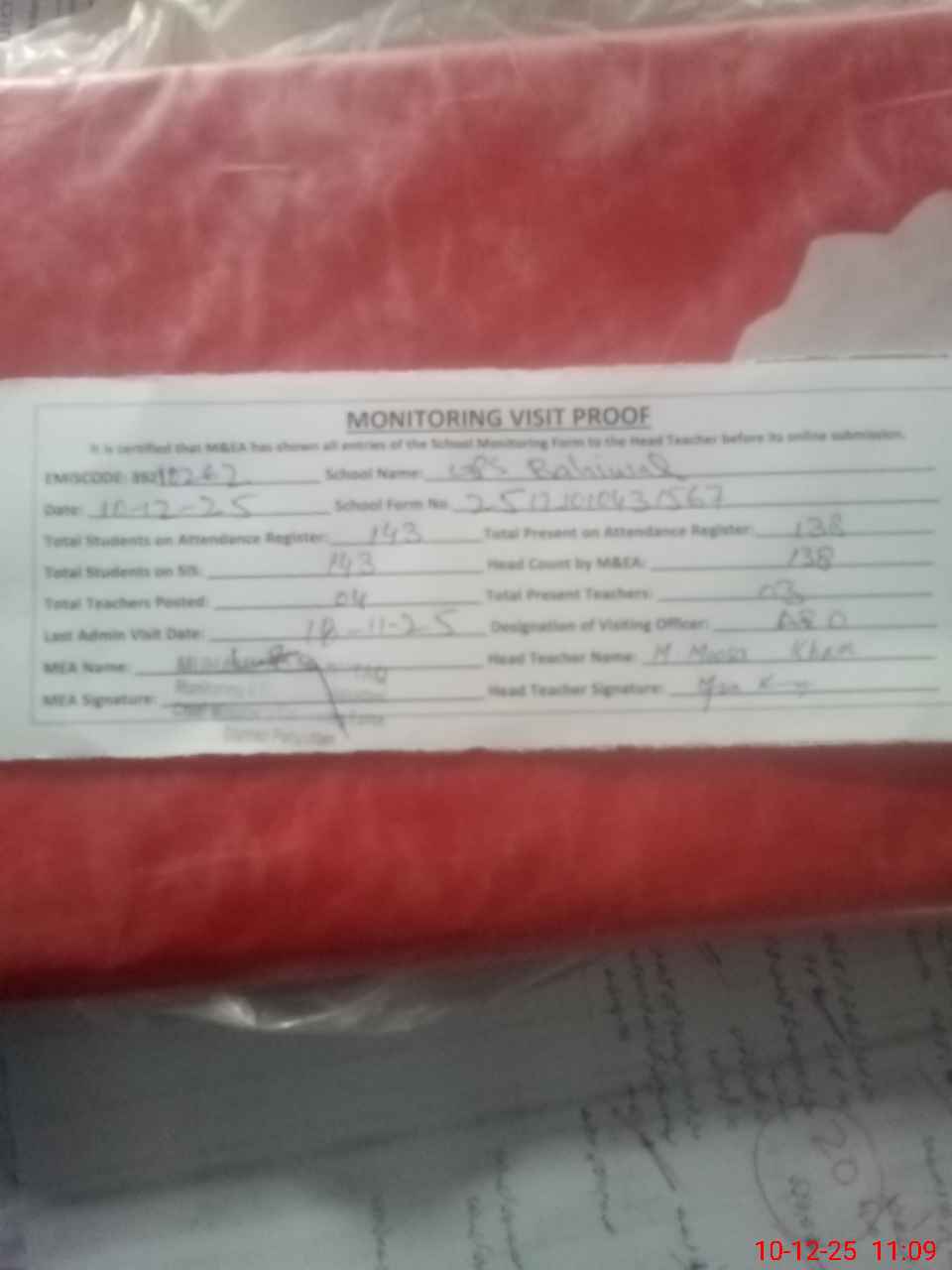 | Attendance Register | Head Teacher | MEA with School | Visit Proof |